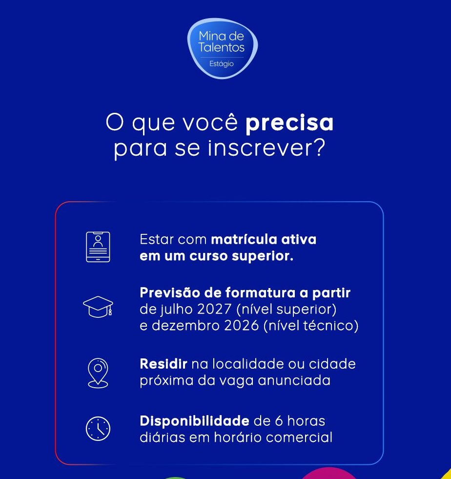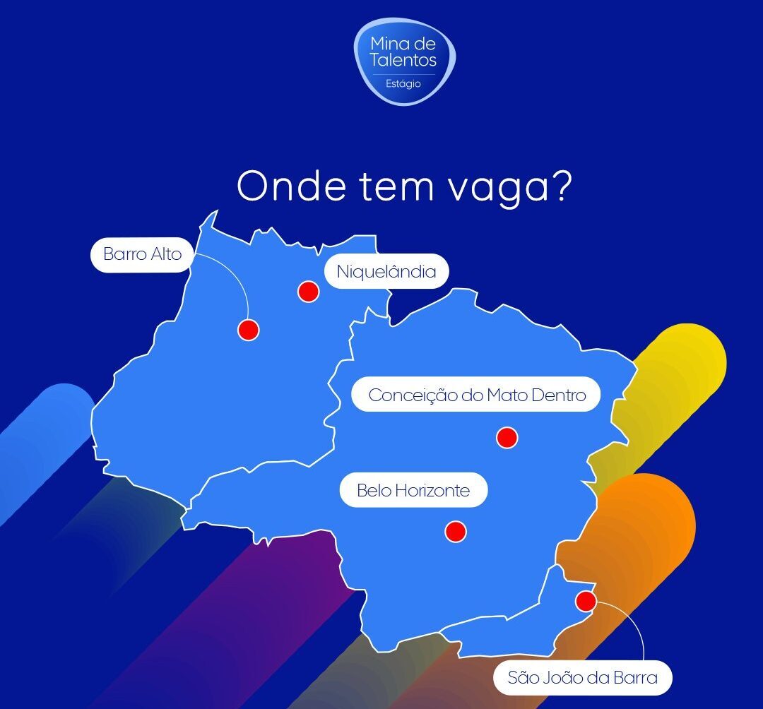 O programa de estágio da Anglo American, Mina de Talentos, está com as inscrições abertas até a próxima sexta-feira/19. As vagas são destinadas a estudantes de cursos de graduação e ensino técnico para atuação nos municípios de Belo Horizonte (MG), Conceição do Mato Dentro (MG), Barro Alto, Niquelândia, e São João da Barra (RJ).