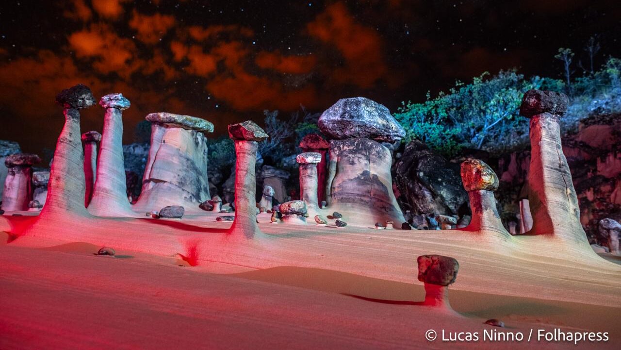 Parece cenário de filme de ficção científica, mas está em Goiás o primeiro conglomerado geológico brasileiro conhecido como “chaminés de fada”, estruturas em que uma torre sustenta rochas arredondadas na ponta.