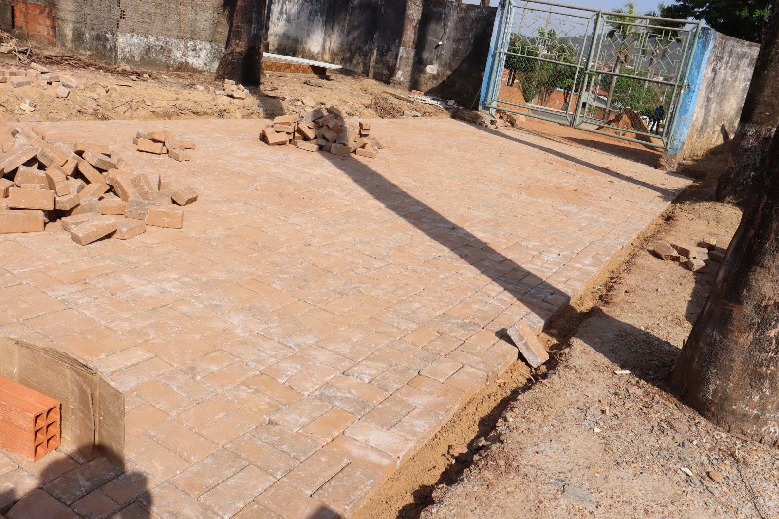 Retirada de bloquetes de concreto do antigo piso do estacionamento no prédio do Fórum de Niquelândia, durante reforma executada pelo TJGO, está garantindo melhorias no pavimento no único cemitério da cidade do Norte do Estado: mão de obra carcerária trabalha no local