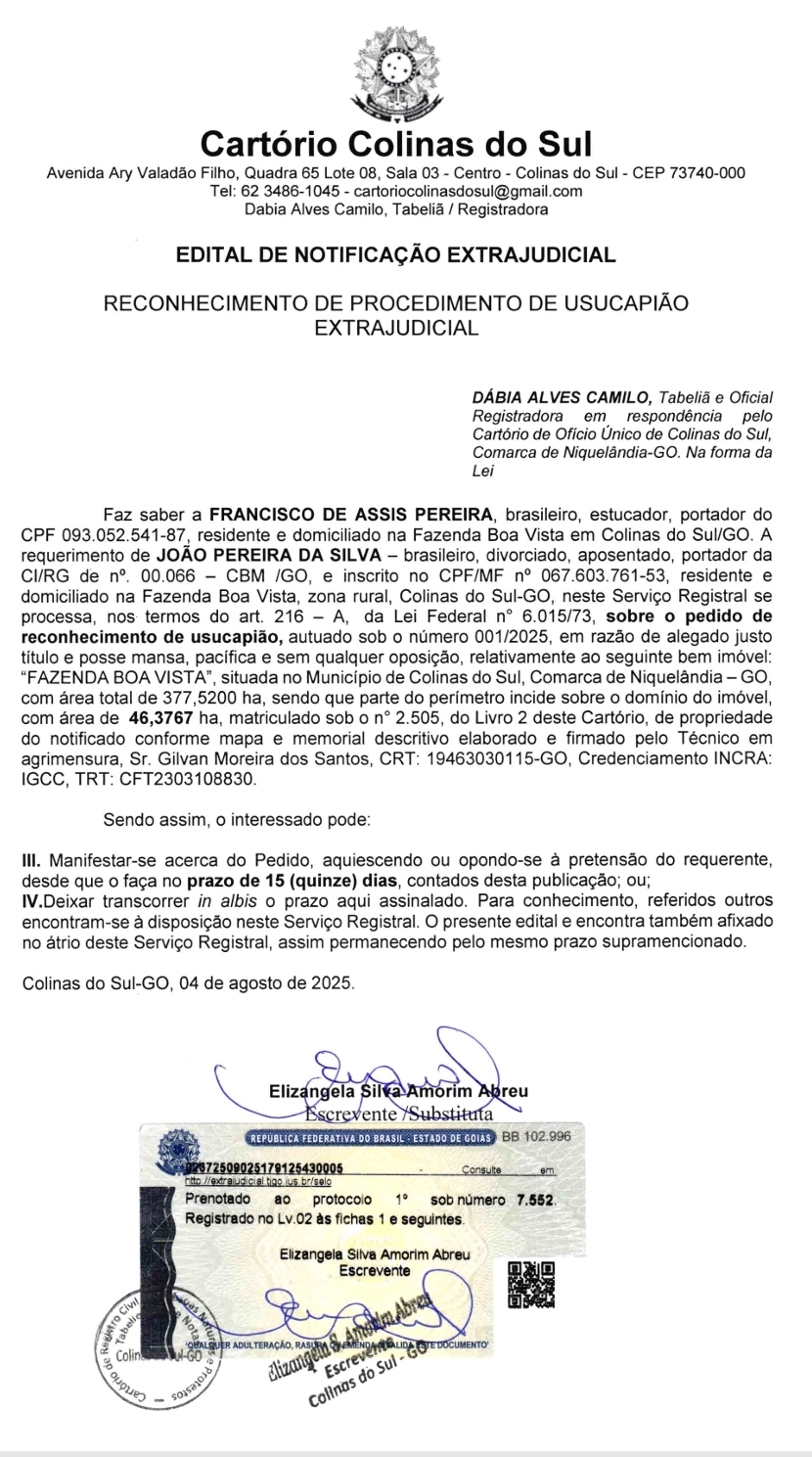 CARTÓRIO DE OFÍCIO ÚNICO DE COLINAS DO SUL – EDITAL DE NOTIFICAÇÃO EXTRAJUDICIAL – RECONHECIMENTO DE PROCEDIMENTO DE USUCAPIÃO [1ª PUBLICAÇÃO – 24/10/2025]