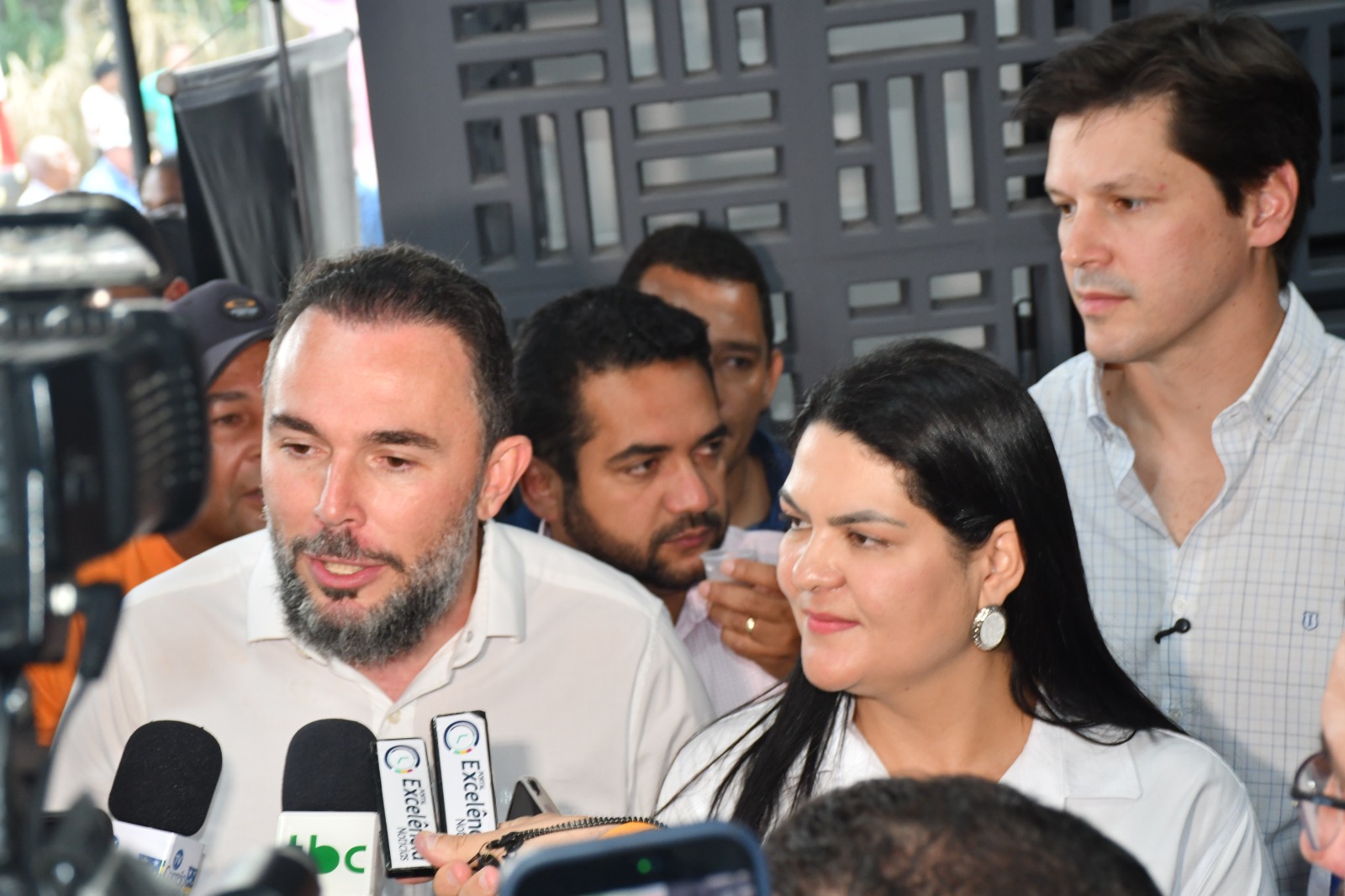 Eduardo Moreira, prefeito de Niquelândia, durante entrevista coletiva à imprensa acompanhada pelo Portal Excelência Notícias, juntamente com a primeira-dama Claudia Moreira, observado ao fundo por Daniel Vilela: chefe do Executivo manifestou gratidão pelo investimento da OVG na unidade local do Restaurante do Bem [Foto: Excelência Notícias]