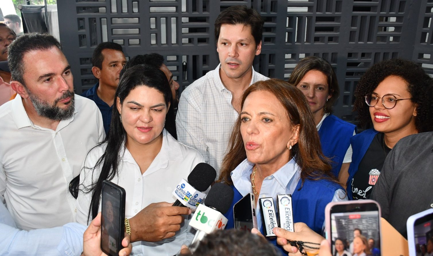 Observada pelo prefeito Eduardo Moreira e pela primeira-dama Claudia Moreira, tendo o vice-governador Daniel Vilela ao fundo da imagem, a presidente de honra da OVG, Gracinha Caiado, atendeu a imprensa antes do início do evento em Niquelândia [Foto: Excelência Notícias]