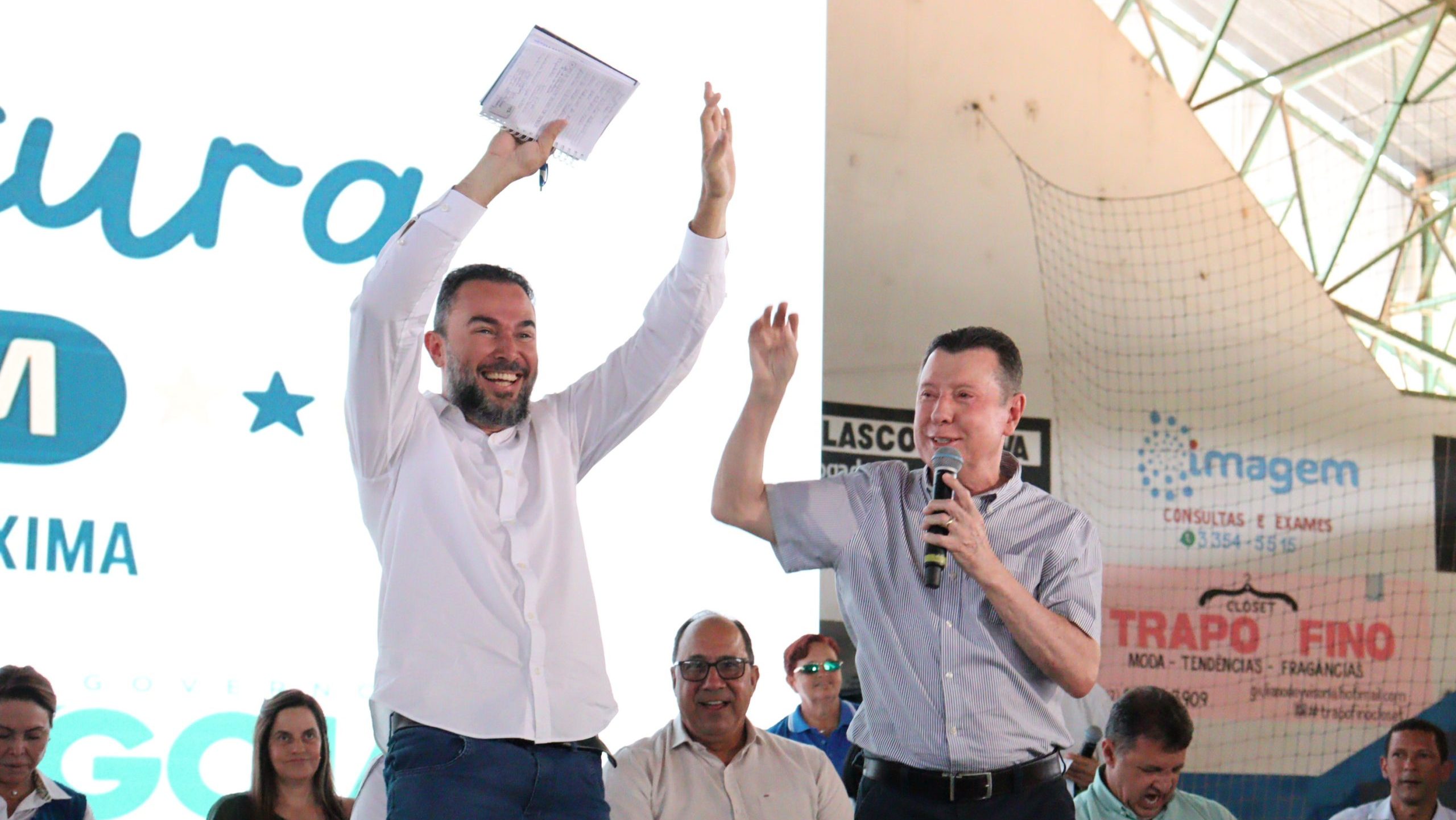 Eduardo Moreira é saudado pelo público no Ginásio de Esportes de Niquelândia durante discurso do deputado federal José Nelto: parlamentar tornou-se ‘figurinha carimbada’ na cidade do Norte desde as eleições municipais de 2024 [Foto: João Eustáquio/SECOM Niquelândia: